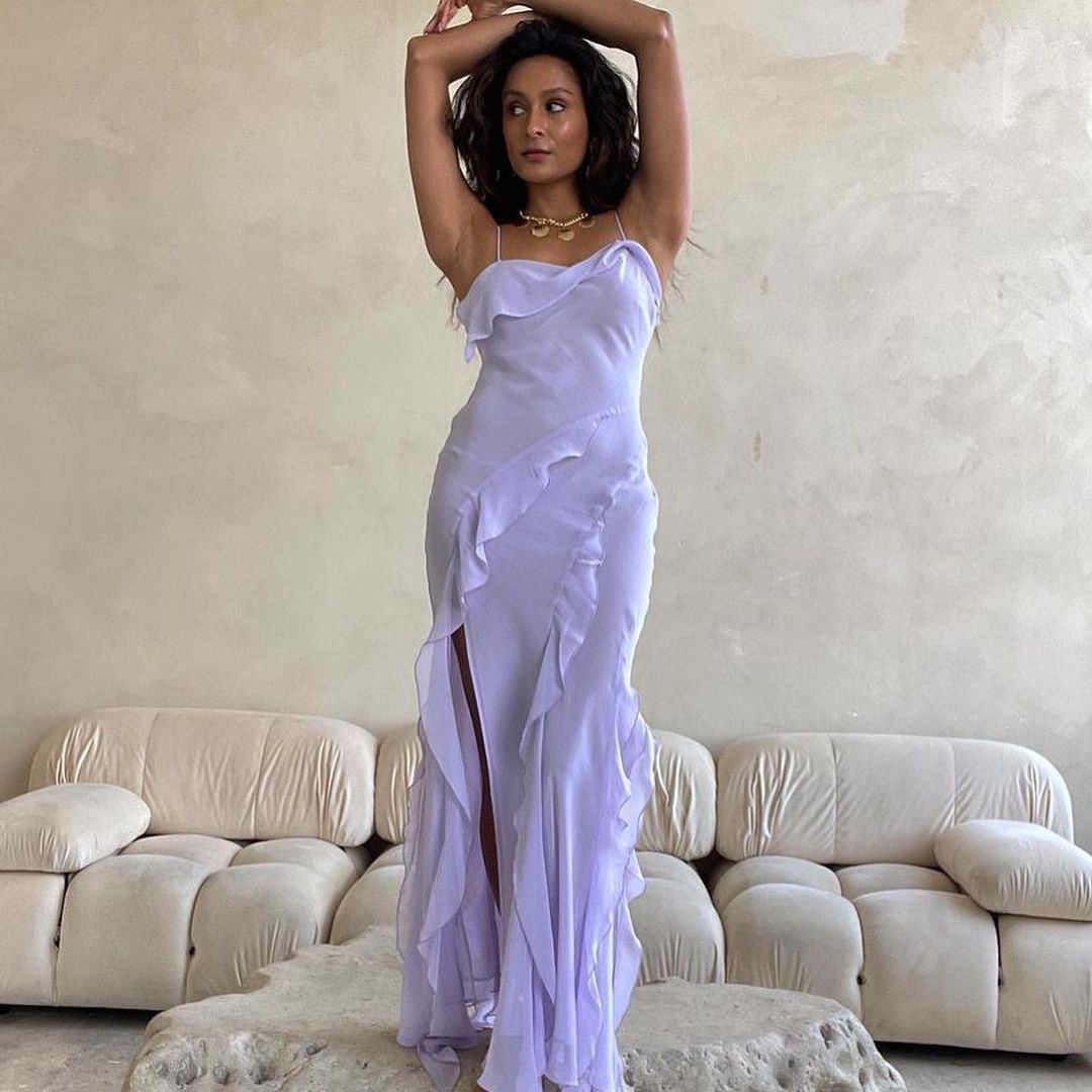 Neuer, voluminöser Chiffonrock mit sexy Neckholder, Schlitz und Rüschen