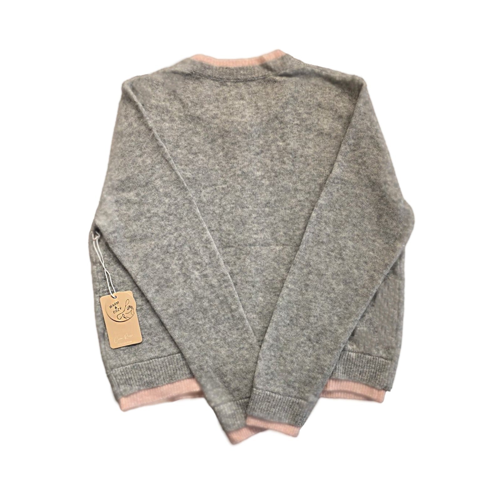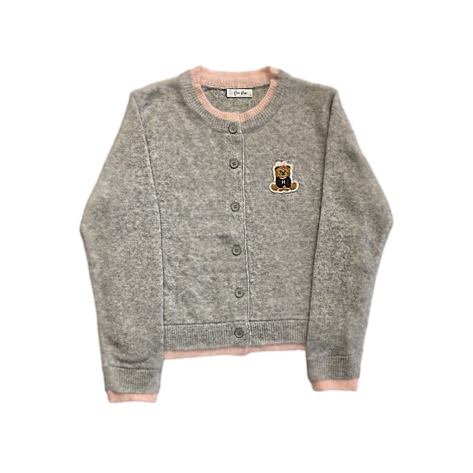 Diese graue Strickjacke vereint Gemütlichkeit mit einem verspielten Detail. Das weiche Strickmaterial sorgt für wohlige Wärme, während die kontrastierenden rosa Bündchen an Kragen, Ärmeln und Saum einen frischen Akzent setzen. Highlight ist die süße Teddy-Applikation mit Schleife auf der Brust, die der Jacke einen charmanten, jugendlichen Look verleiht.