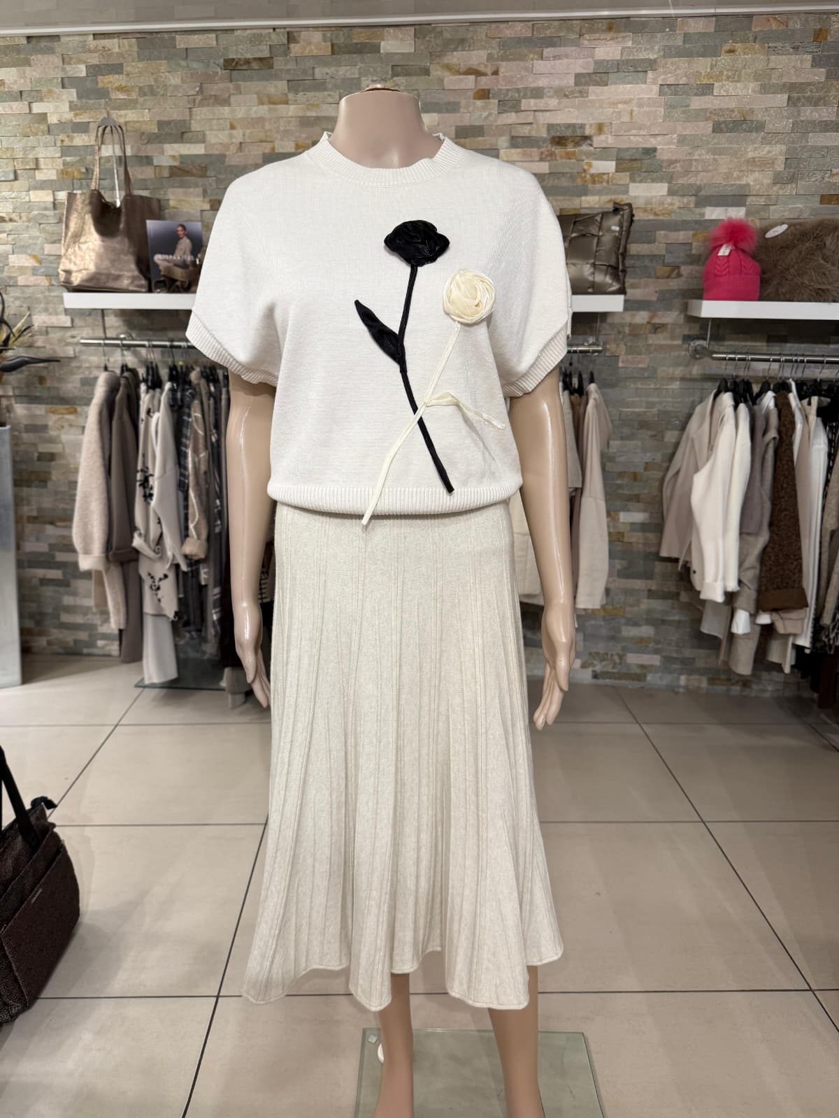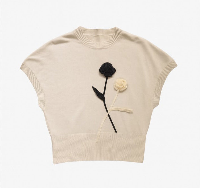Diese stilvolle Strickweste vereint schlichte Eleganz mit einem raffinierten Detail. Das hochwertige Material in zartem Creme-Ton sorgt für ein angenehmes Tragegefühl und lässt sich vielseitig kombinieren. Ein besonderer Hingucker sind die aufgesetzten Blumen-Applikationen in Schwarz und Creme, die der Weste eine moderne und zugleich feminine Note verleihen.