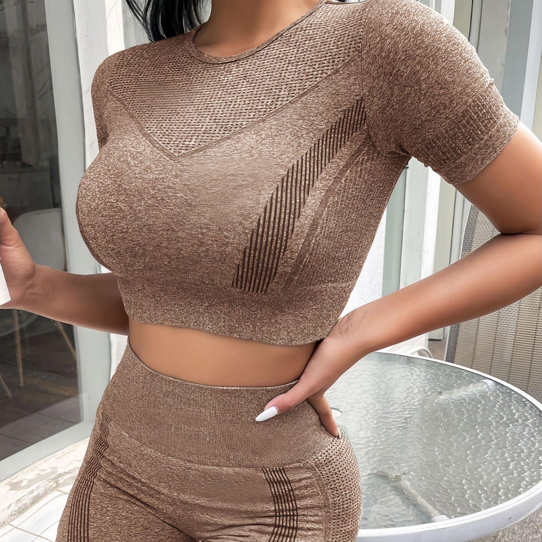 Dieser nahtlose, gestreifte Yoga-Anzug besteht aus einem bequemen Kurzarm-Oberteil und einer passenden Hose, die für eine geschmeidige, flexible Passform bei allen Arten von Workouts sorgen. Das weiche, atmungsaktive und dehnbare Material macht jede Bewegung mit und bietet optimalen Halt bei Yoga, Pilates, im Fitnessstudio oder im Alltag. Die nahtlose Verarbeitung reduziert Reibung, und das stylische Streifenmuster verleiht Ihrer Sportgarderobe eine moderne und schmeichelhafte Note.